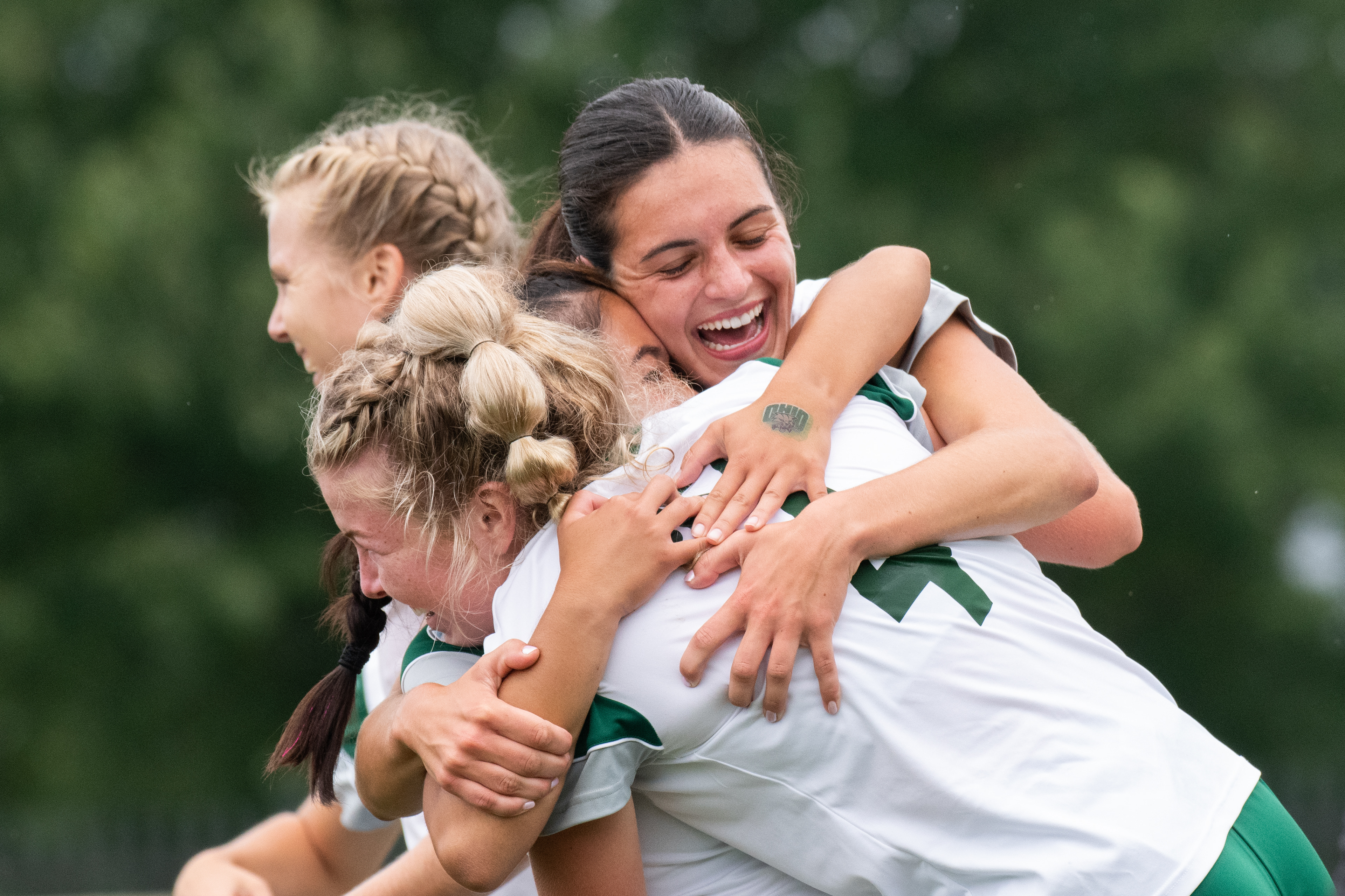 Ohio University Midfielder Eve Berish hugs teammate Maia Kaufman after Kaufman’s goal during their game against Virginia Military Institute at Chessa Field in Athens, Ohio, on Sunday, Sept. 4, 2022. The Bobcats went to win the game 11-0.